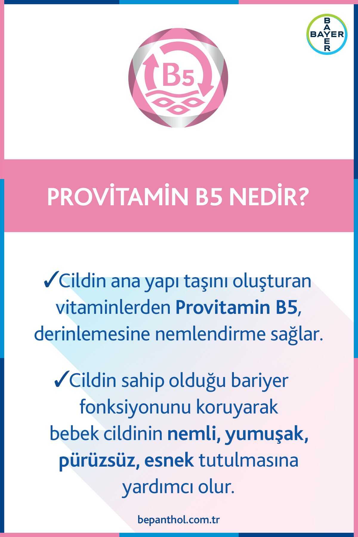 Özellikle ilk aylarında bebeğiniz oldukça hassas bir cilde sahiptir. Mükemmel bir biçimde doğarlar ancak birçok faktör hassas ciltleri için tehdit oluşturabilir. Bepanthol® Baby minik bebeğinizin hassas cildini olumsuz etkenlere karşı korumak için özel olarak geliştirilmiştir. Bepanthol® Pişik Önleyici Merhem'in koruyucu, parfüm, paraben ve SLS içermeyen formülü minik bebeğinizin hassas cildi için her kullanımdan itibaren koruma sağlar. Bepanthol® Baby Pişik Önleyici Merhem, pişik oluşumunun önlenmesine yardımcı olur. İçeriğindeki %5 oranındaki Provitamin B5 ile cildi nemlendirir. Cildin sahip olduğu bariyer fonksiyonunu koruyarak bebek cildinin nemli, yumuşak, pürüzsüz, esnek tutulmasına yardımcı olur. İçeriğinde yer alan lanolin, cildi kayganlaştırıcı etkisi ile pişik oluşumunun sebeplerinden biri olan sürtünmeyi azaltır. Geçirgen yapısı ile cildin hava almasını engellemeden cildin nemlenmesine yardımcı olur. Koruyucu, parfüm, paraben ve SLS içermez. Her bez değişiminde kullanıma uygundur. Yapışkan olmayan yapısıyla bebeklere ekstra rahatlık, annelere de kolay temizleme imkanı sunar. Kullanımıİnce bir tabaka Bepanthol® Pişik önleyici Merhem'in bebeğinizin temiz, kuru poposuna her bez değişiminden sonra uygulanması önerilir. Bepanthol® Pişik Önleyici Merhem yapışkan olmayan yapısıyla, kolayca temizlendiğinden bebeğe konfor sağladığı kadar anneye de kolaylık sağlar.