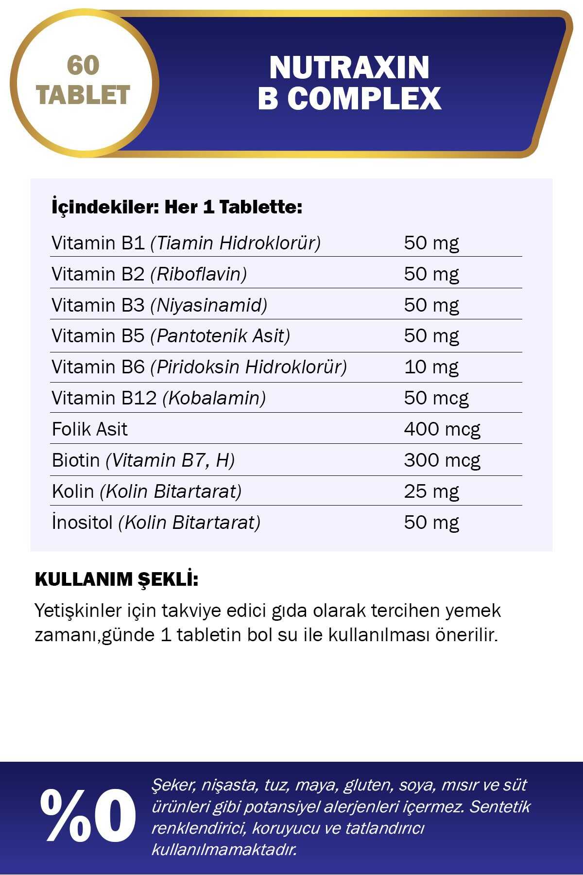 Nutraxin B Complex; B1, B2, B3, B5, B6, B12 ile birlikte folik asit, biotin, kolin, ve inositol vitaminlerinden oluşan karışım üründür.