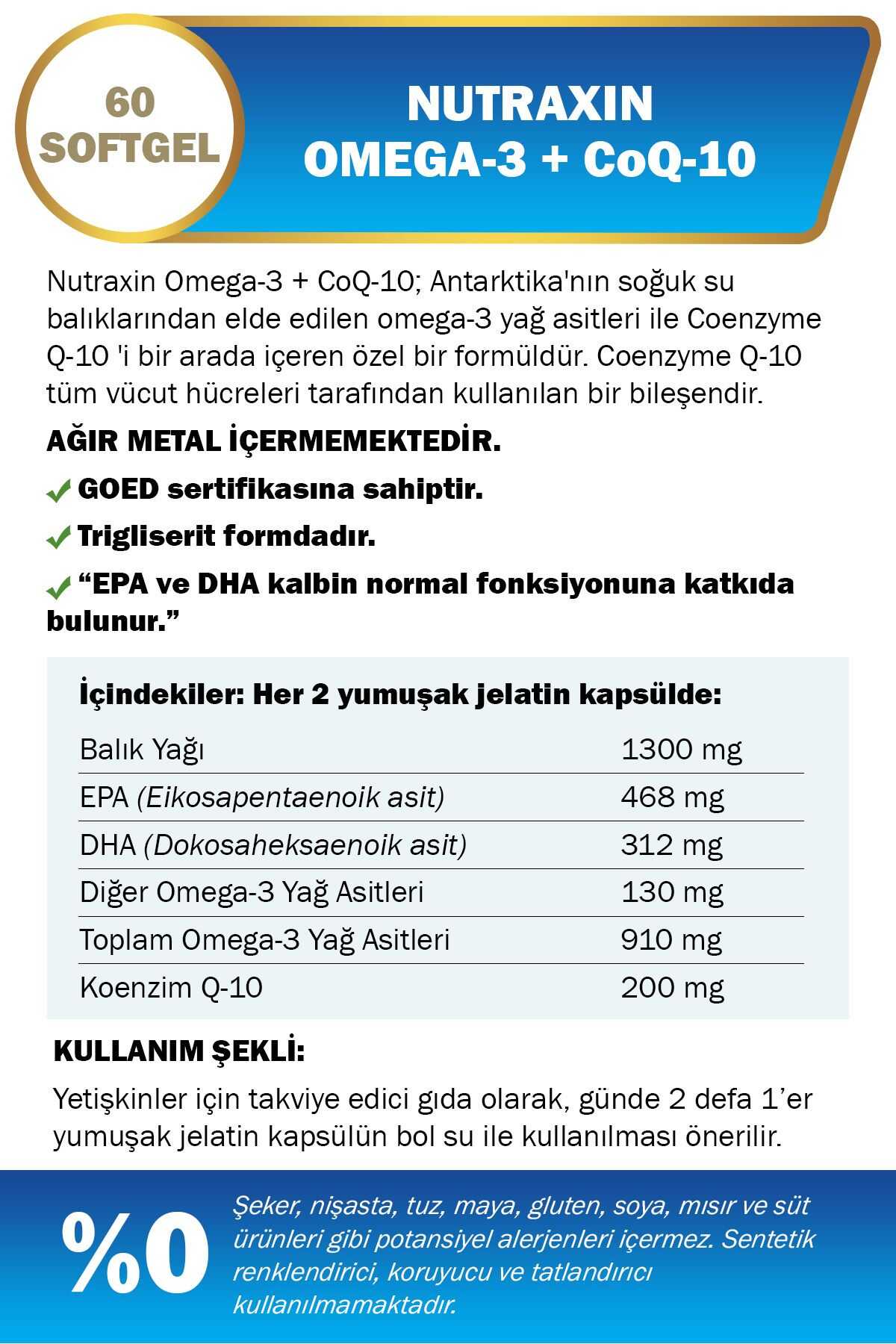 Nutraxin Omega-3 + CoQ-10; ağır metallerden uzak, temiz ve soğuk sularda yaşayan, küçük cins balıklardan elde edilen omega-3 yağ asitleri ile Coenzyme Q-10 'i birarada içeren özel bir formüldür. Coenzyme Q-10 tüm vücut hücreleri tarafından kullanılan bir bileşendir.Etken madde GOED sertifikasına sahiptir.