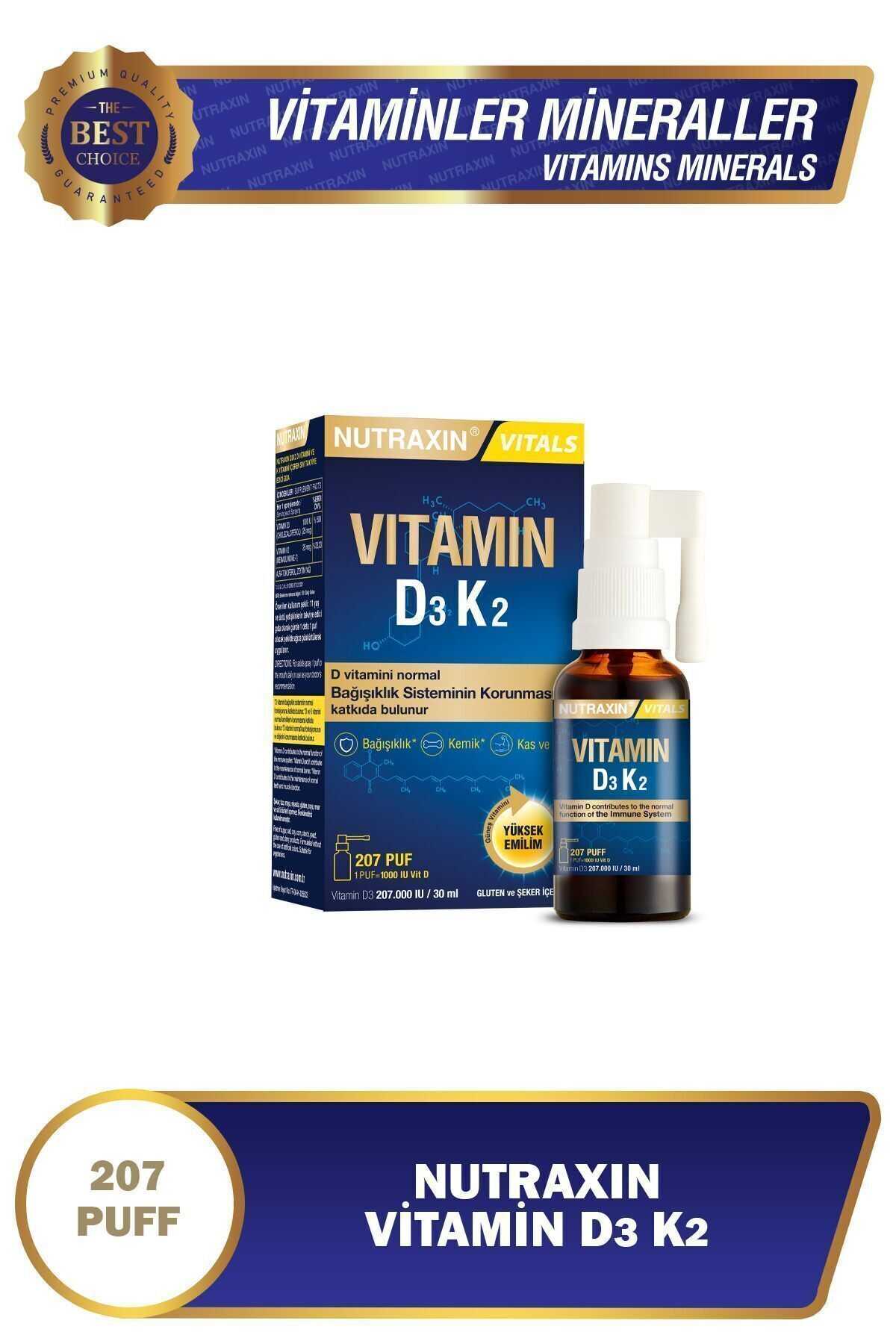 Nutraxin D3K2 vitamini; kolakalsiferol formunda D3 vitaminini ve Menakinon-7 formunda K2 vitamini içerir. Nutraxin D3K2 vitamini her spreylemesinde 1000 IU D3 vitamini ve 25 mcg K2 vitamini içermektedir.