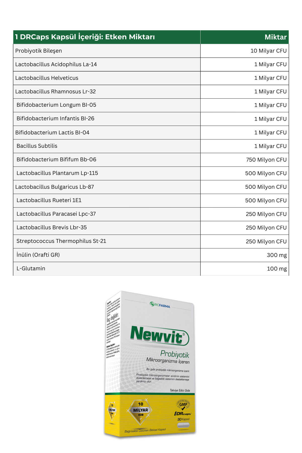 Newvit Probiyotik 30 Kapsül | 14 Farklı Probiyotik Kültür + L-Glutamin İlavelidir