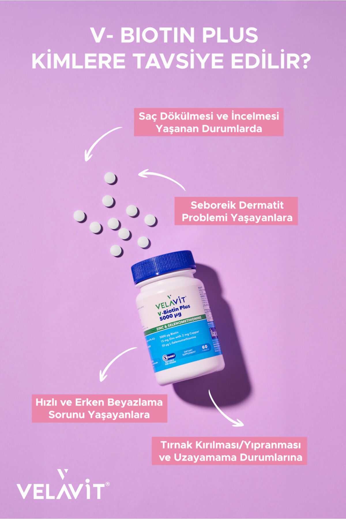 Biotin, Çinko ve Selenyumlu Takviye Edici Gıda V-Biotin Plus 5000 µg, zengin içeriğiyle vitamin ve mineral desteği sunar.